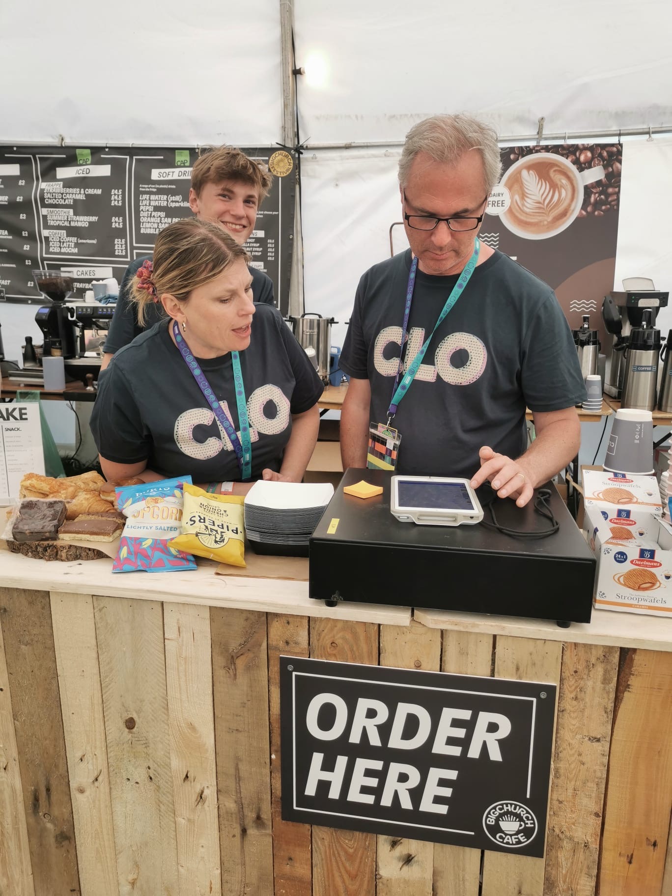 This Summer, this cafe is shared with the BCF Merch Tent. Full Barista menu but served and ordered through the large wooden frontage outside. No inside seating - its all benches outside.